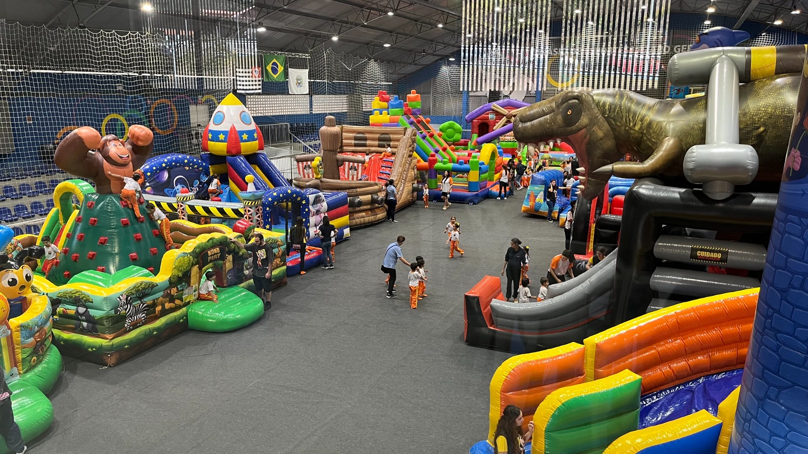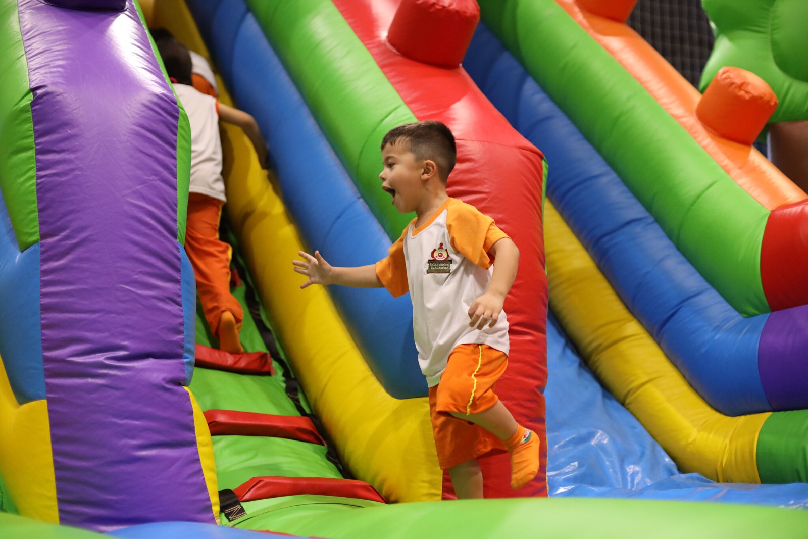 Participam os alunos da Educação Infantil, de 2 a 6 anos de idade, e neste ano os brinquedos contam com temas variados, como fazenda, galáxia, circo, floresta, mundo dos dinossauros e muito mais. A ideia é estimular o convívio social, a atividade física e promover diversão em diversos escorregadores e pula pulas que ocupam toda a quadra, com toda a segurança necessária.